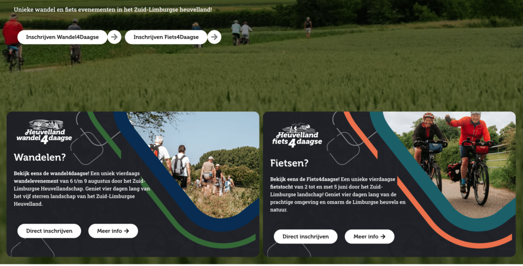 Voorheen opereerden de wandel- en fietsvierdaagse volledig los van elkaar, zonder duidelijke online verbinding. Er ontbrak een centrale plek waar bezoekers kennis konden maken met het bredere Heuvelland-concept. Hierdoor ging merkherkenning verloren en was er geen logische instap voor nieuwe doelgroepen. De uitdaging was om één overkoepelende landingspagina te creëren die beide evenementen verbindt, de gezamenlijke identiteit versterkt en bezoekers op een duidelijke, aantrekkelijke manier doorstuurt naar de juiste website.